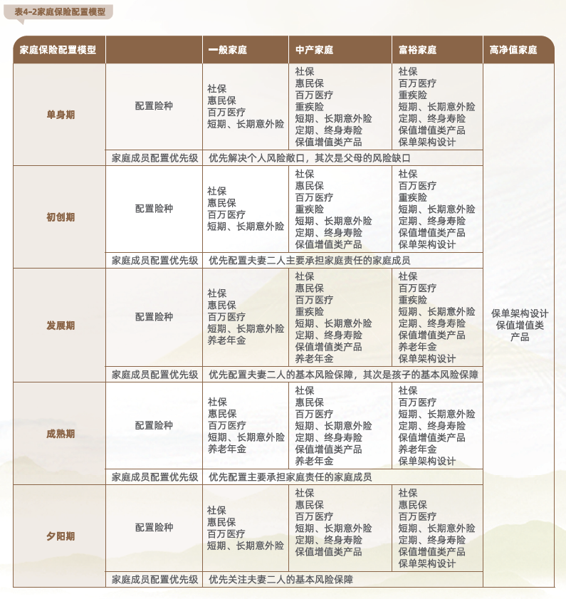 白皮书研究建议,动态生命周期下不同财富水平的家庭有不同的风险和保护重点。例:第一阶段,普通家庭应优先预防“大病花钱、收入意外损失”;中产家庭在成长阶段,面临着“大病、子女教育”的双重压力。结合研究结果,白皮书对不同生命周期、不同财富层次面临的基本风险以及需要解决的优先事项进行了分类,符合保险形式化解这些风险的要求,并总结了20种常见的家庭风险分配模型。